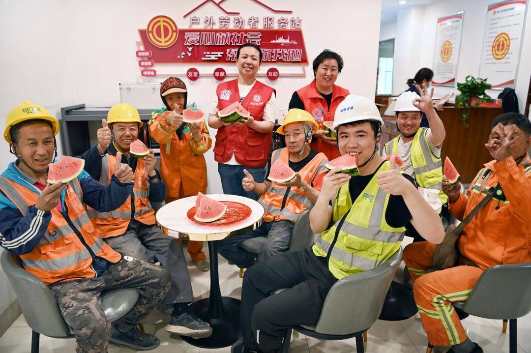 지난 6월 14일, 선양시의 최고 기온이 29℃에 달했다. 여러 명 건축공, 환경 미화원, 택배원들은 선허구 지엔웬 사회구역의 ‘야외 노동자 쉼터’에서 피서하며 자원봉사자들이 선물한 수박을 맛있게 먹고 있었다.