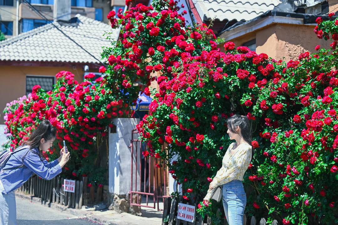 다롄시 중산구 바오웨이샹에서는 오래된 건축 앞에 유연한 꽃가지와 화려한 꽃들이 길게 이어져 꽃벽을 이루고 있다. 진홍색부터 연분홍색까지 다양한 장미들이 한 여름날에 낭만을 더해주고 있다. 시민과 관광객들은 낭만이 깃든 골목을 거닐며 도시의 정취를 만끽하고 있다.