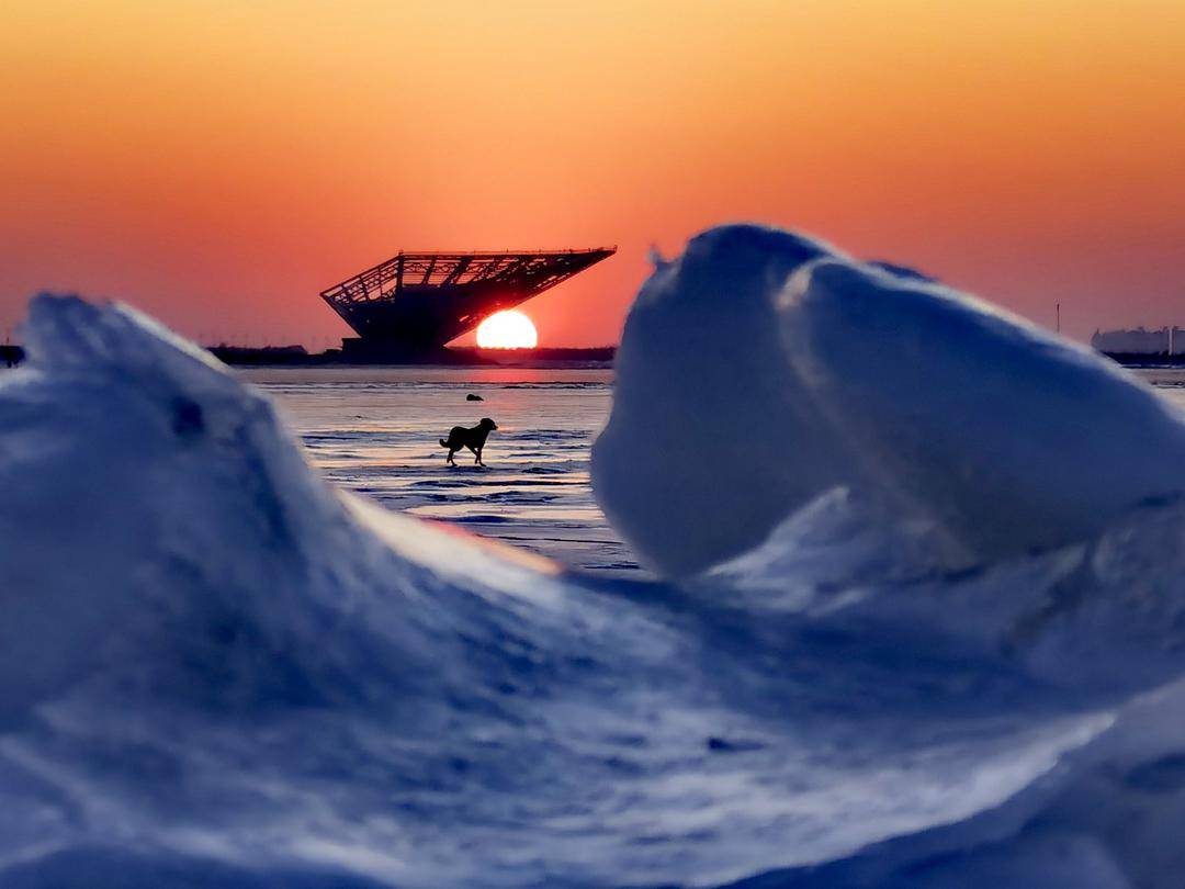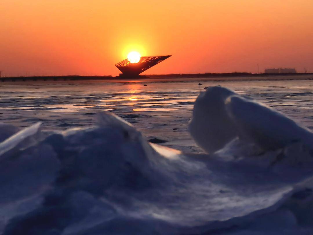 최근 한파가 지속되면서, 겨울의 잉커우 바위취안 진타이청 해안은 얼음바다로 변모했다. 석양이 지면 금빛 햇살이 푸른 얼음판과 부딪치며 북방의 겨울에 더없이 낭만적인 정취를 더해준다. 먼 곳에 서 있는 '바위공주' 조형물과 '보하이 진주' 전망대는 저녁 노을 속에서 강인한 실루엣을 드리우고 부드러운 얼음판과 따뜻한 석양과 선명한 대비를 이룬다.